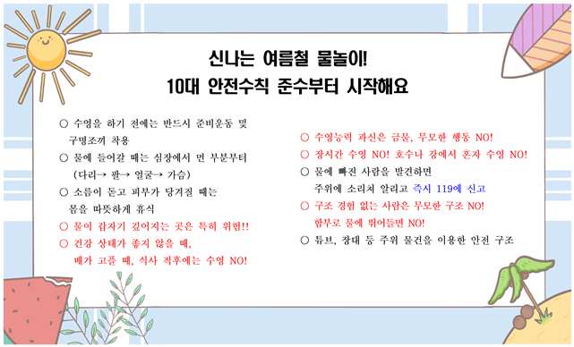 * 첨부파일을 참고하시어 여름철 물놀이 안전에 유의하시기 바랍니다.