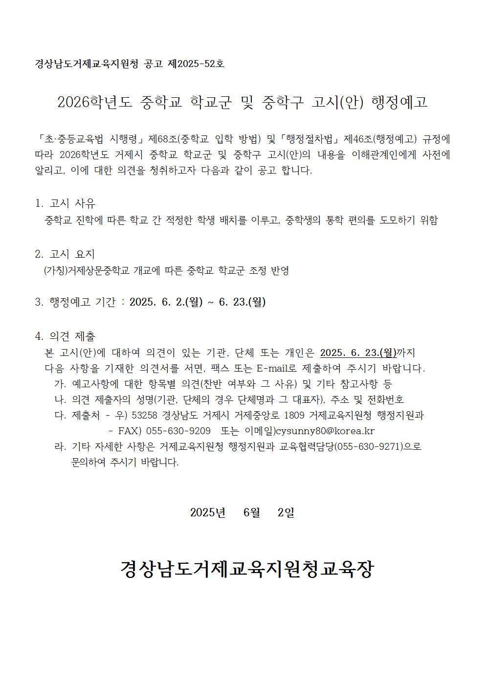 2026학년도 중학교 학교군 및 중학구 고시(안) 행정예고 시행 알림