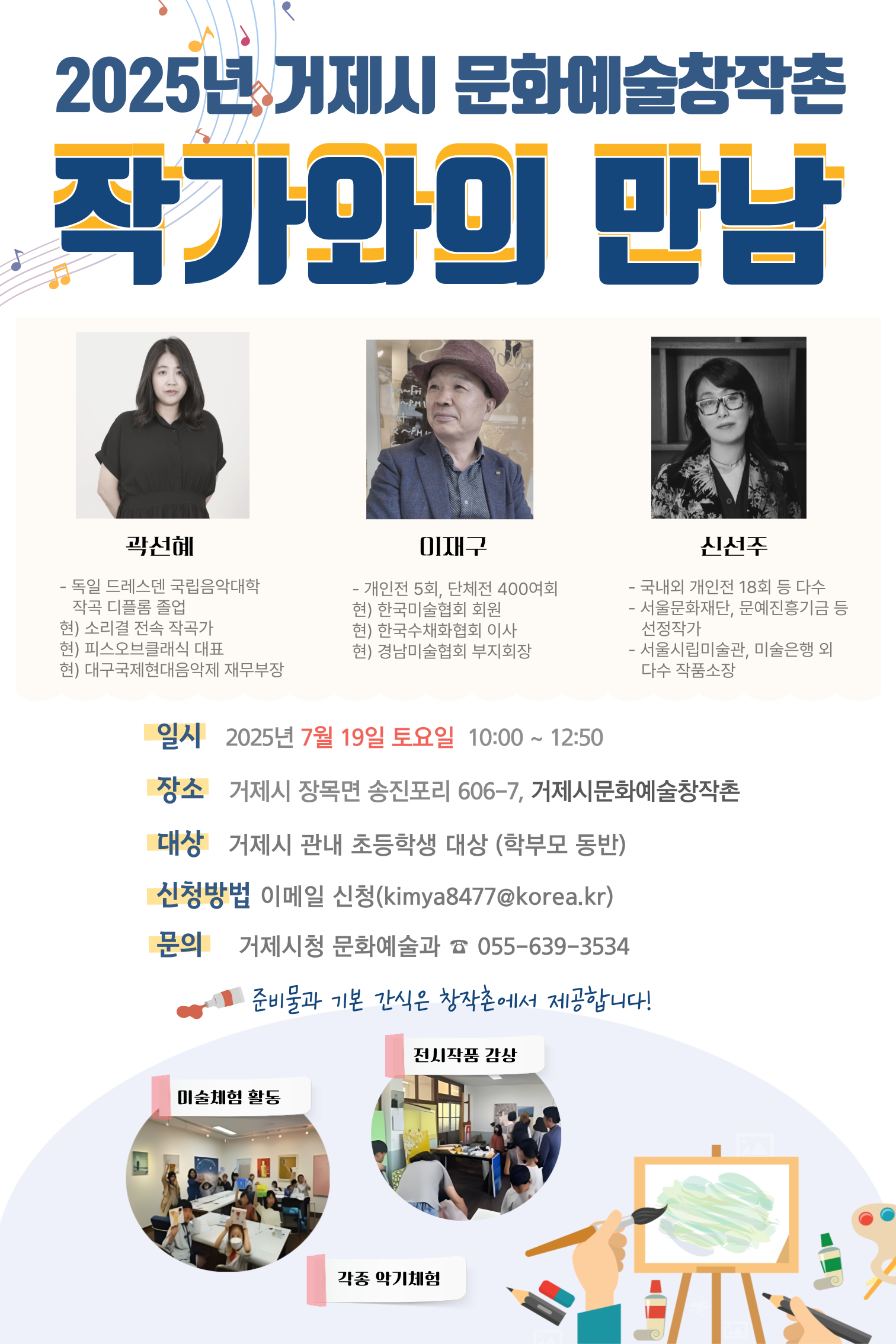 거제시에서 관리·운영하는 장목면 소재「거제시문화예술창작촌」에서 관내 초등학생을 대상으로 '2025년 거제시문화예술창작촌 작가와의 만남' 프로그램을 실시하고자 하오니, 관심있는 학생들과 학부모님들의 많은 신청 바랍니다.